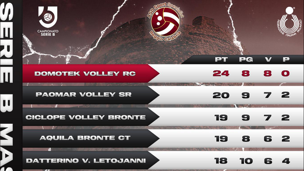 Cifre perfette per meglio dettagliare il magnifico ruolino di marcia della Domotek Volley Reggio Calabria - si legge in una nota della società reggina -, che ha agguantato il torneo sin dal primo pallone giocato e se ne sta impadronendo con costanza lineare. Ha fatto rumore, tra le partite del decimo turno di Serie B, il secondo tonfo consecutivo dell'Aquila Bronte che, inanellati sei successi in fila, non è riuscita a rialzarsi, complici i tre infortunati ed uno squalificato, nella stracittadina contro la Ciclope (0-3), dopo essere caduta sul campo della Raffaele Lamezia. Ai piani alti tutti gli occhi, invero, erano puntati sul faccia a faccia tra Paomar Solarino Siracusa e Raffaele Lamezia: a fare festa al termine di una partita equilibrata sono stati i siciliani (3-1) ancora imbattuti nelle gare affrontate all'interno del bollente tensostatico "Triolo". Nel frattempo, ha ritrovato il bandolo della matassa, smarrito la settimana precedente contro la Domotek Volley Reggio Calabria, il sestetto della Datterino Letojanni brillante nel derby peloritano con la Sicily F.lli Anastasi Messina (3-0), che ancora non riesce a sollevarsi dalla palude della graduatoria dove annaspa zavorrata da quello 0 del quale liberarsi al più presto.