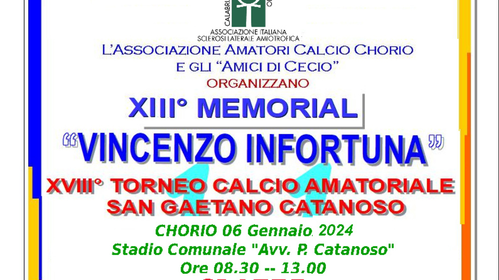 La comunità di Chorio di San Lorenzo è in fermento in vista del tradizionale Memorial Vincenzo Infortuna, che si terrà in occasione della festività dell'Epifania presso lo Stadio comunale Pietro Catanoso di Chorio. Dalle 08:30 della mattina alle ore 13:00, l'evento coinvolgerà numerosi atleti di tutte l’età con lo scopo di sostenere AISLA Reggio Calabria.